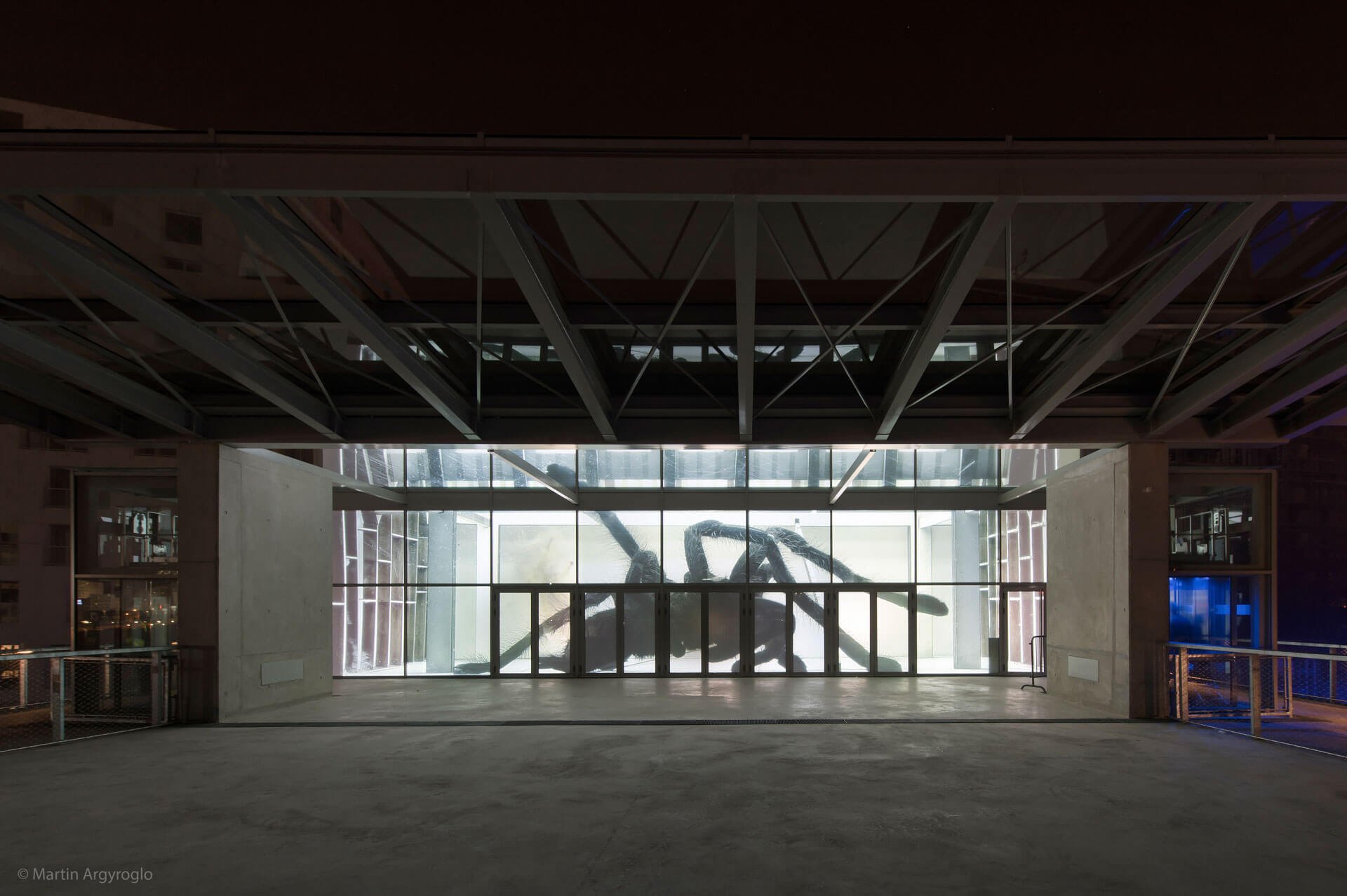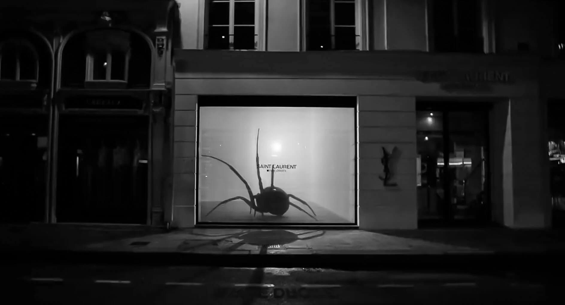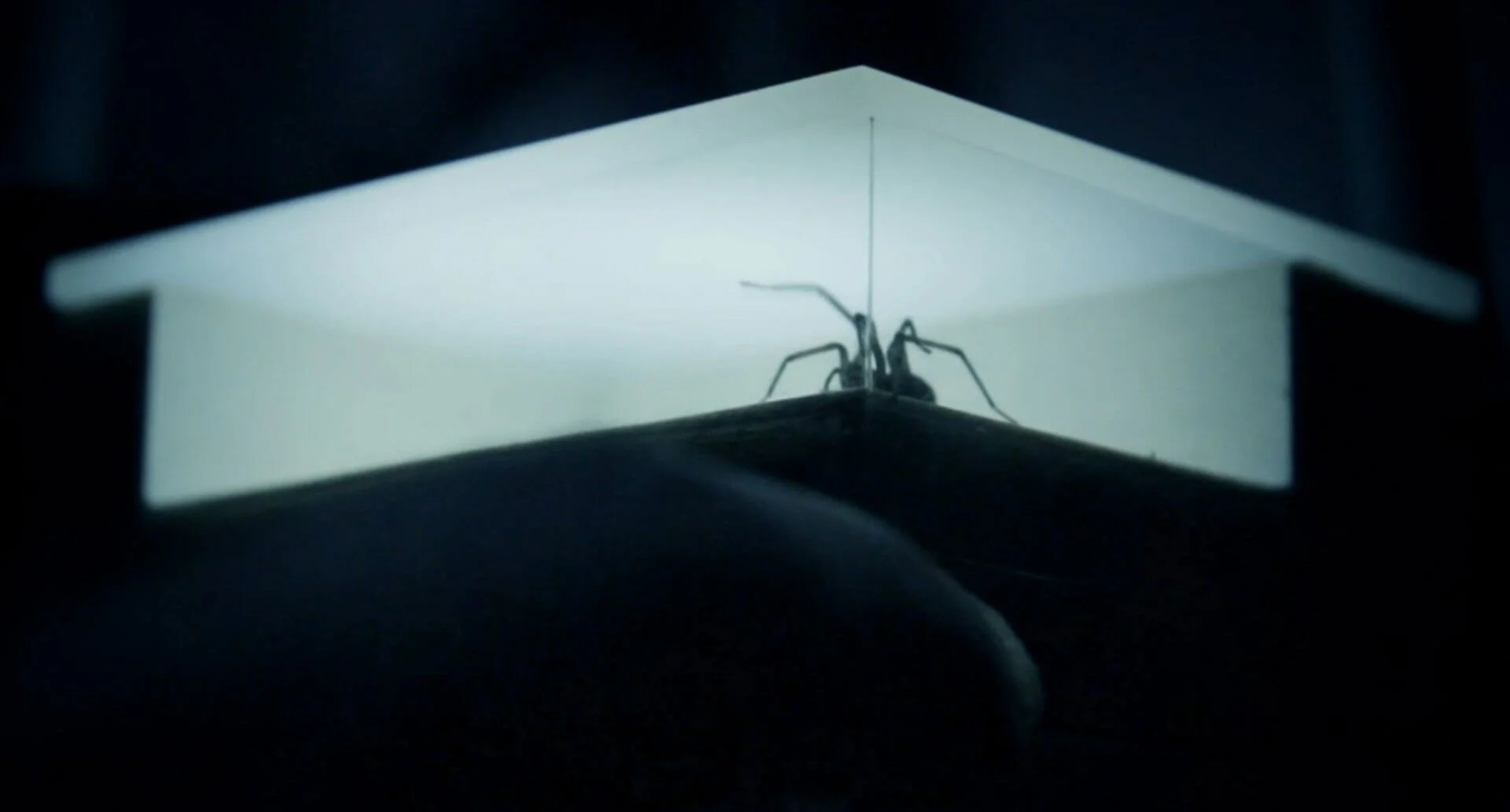 Using projection mapping, small spiders were placed within scale models of various buildings and filmed from the viewer’s perspective. The footage was then projected from inside onto the windows, creating the illusion of enormous spiders confined within the structures.